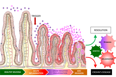 La inflamación, en realidad, impulsa los desequilibrios microbianos (disbiosis) y la proliferación de un tipo específico de E. coli que es adherente, invasor y se encuentra en el íleon, informaron investigadores de Cornell 31 de julio en PLoS (7 [7]). Y la genética, dicen, juegan un papel en la determinación del umbral y la magnitud de disbiosis en respuesta a la inflamación aguda inducida por factores ambientales desencadenantes.