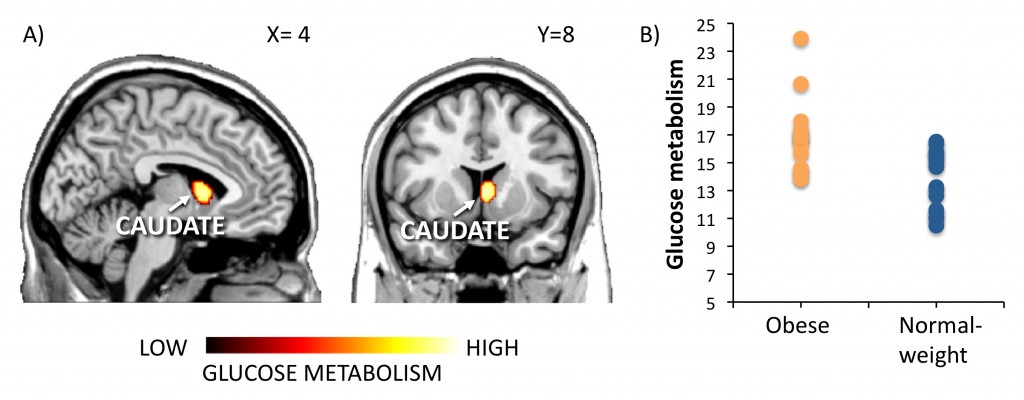 Los resultados revelaron que en los individuos obesos con respecto a delgados, el metabolismo cerebral de glucosa fue significativamente mayor en las regiones del cuerpo estriado del cerebro, que están implicadas en el procesamiento de las recompensas. Además, el sistema de recompensa individuo obeso respondió con más fuerza a las imágenes de comida, mientras que las respuestas en las regiones frontales corticales implicadas en el control cognitivo se atenuaron.