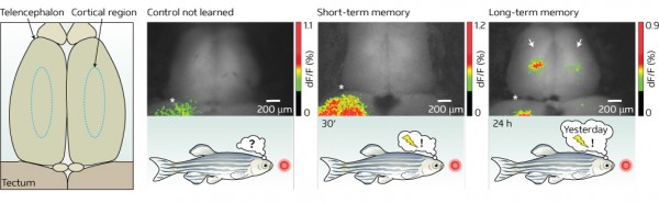 Luego, los investigadores examinaron la actividad neuronal de los peces bajo el microscopio en respuesta a la exposición a la luz roja. Un día después de la tarea de aprendizaje, el pez mostró actividad específica en una región discreta del telencéfalo, que corresponde a la corteza cerebral en mamíferos, cuando se presenta con la luz roja. Sin embargo, sólo 30 minutos después de la tarea de aprendizaje no se observó actividad en esta parte del cerebro. Los resultados sugieren que esta área telencefálica codifica la memoria a largo plazo para el comportamiento de evitación aprendido. Confirmando esto, retirar esta parte del telencéfalo abolió la memoria a largo plazo, pero no afectó al aprendizaje o el almacenamiento a corto plazo de la memoria.