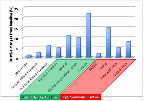 La función ventricular izquierda mejoro en comparación con el valor basal. La fracción de eyección aumentó en un 5% (p = 0,01), mitral excursión sistólica del plano anular (MAPSE) (que evalúa la función ventricular longitudinal) se incrementó en un 11% (p