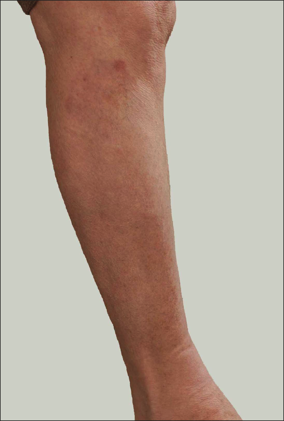 A los 60 años de edad, una mujer blanca fue visitada en situación clínica con 10 años de historia de 4 manchas progresistas asintomáticas en la pierna derecha. El paciente tenía diabetes mellitus tipo 1 que fue bien controlado y había sido así durante todo el período; además de la insulina al día, el único medicamento utilizado fue un fármaco antiinflamatorio no esteroide para el tratamiento de los síntomas de la artrosis.