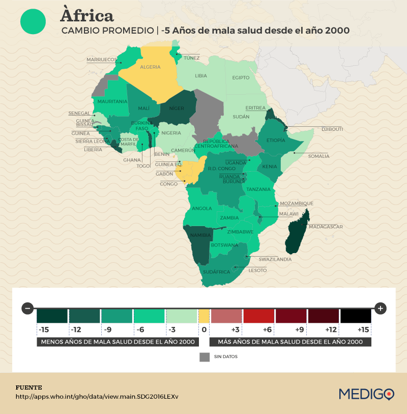 Muchos países africanos han hecho grandes avances en materia de salud y desarrollo desde el principio del siglo 21, que se refleja en los datos de la OMS. Es en África que las mayores reducciones se produjeron en «años de mala salud.