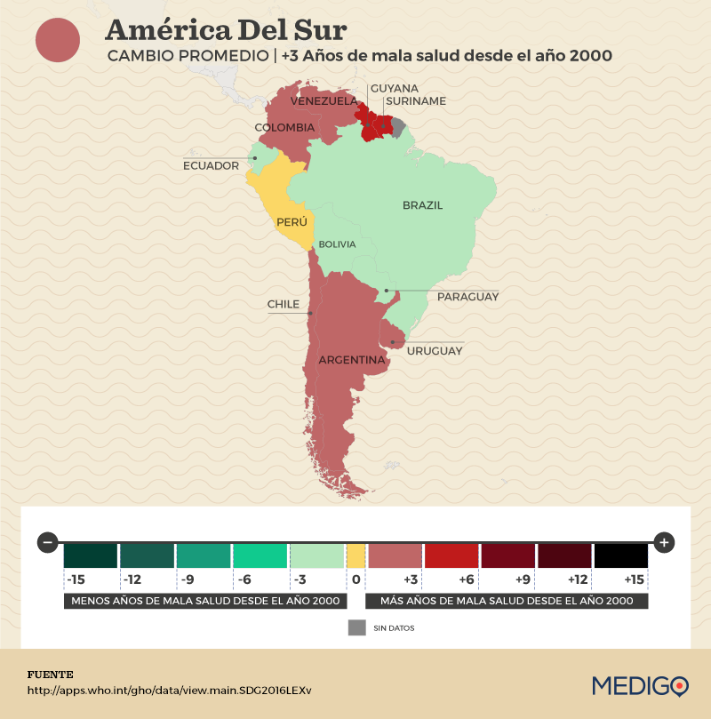 De misma manera, América del Sur muestra una variedad de resultados. Países como Bolivia y Ecuador, tradicionalmente considerados entre los menos desarrollados, han logrado la mayor reducción en los «años de mala salud» del continente.