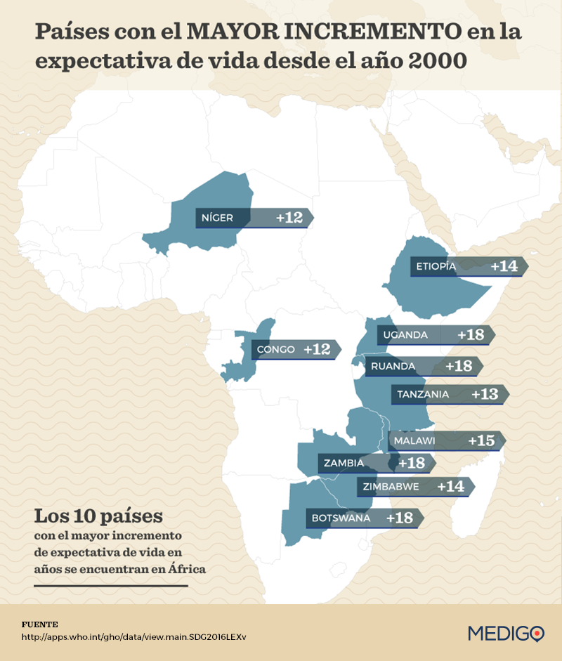Varios países han visto un sorprendente aumento en la esperanza de vida desde el año 2000. Los 10 países con los incrementos más significativos se encuentran en África.