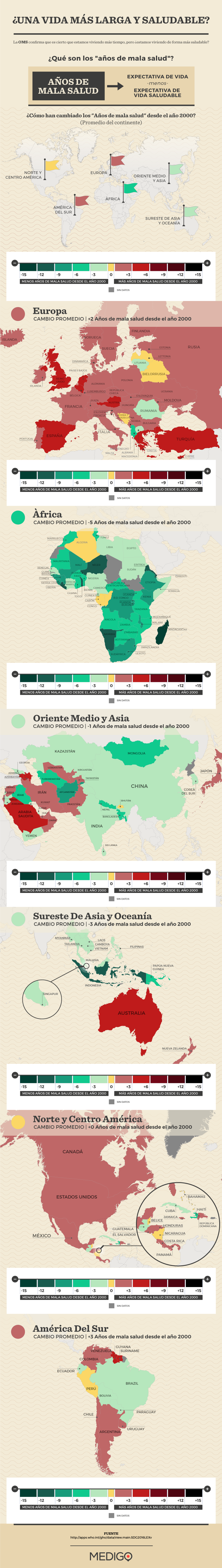 Esta infográfia compara los diferentes continentes y países del mundo con una clara visión en conjunto de los años que vivimos en un mal estado de salud.